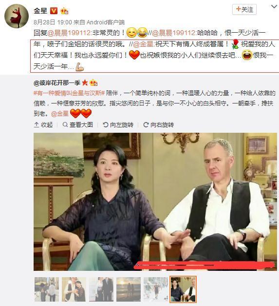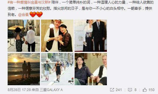 最近,金星在微博晒出和丈夫汉斯的温馨甜蜜照,并配图。