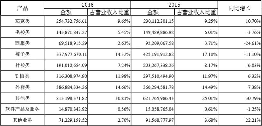 七匹狼营收增长疲乏、盈利能力下滑,与产品销售情况密不可分。2016年七匹狼线上渠道营收约9亿,这里面针纺类产品就约4亿。也就是说七匹狼线上渠道,近一半靠的是内衣、内裤、袜子等低利润产品。从分产品营收来看(如图):