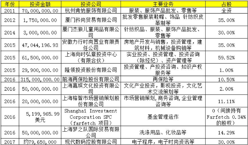 杭州肯纳服饰有限公司,取得奢侈品品牌范思哲、康纳利、乔治杰生在中国的代理业务;Shanghai Investment Corporation SPC(farfetch 项目),入股国际时尚电商平台Farfetch;现代数码控股有限公司,《周末画报》母公司现代传播的子公司。