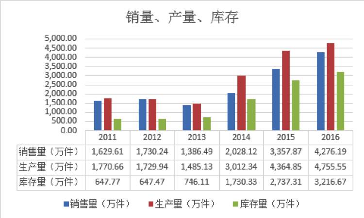 从上图看,2011到2013这三年,销量和产量的差距并不大,库存比较稳定,但2014、2015年产量比销量猛增一大截,导致库存立马上升,2016年虽然销量和产量差距缩小,但库存已经压下。库存与门店数量减少密切相关,这批加盟店的库存在线下,在七匹狼品牌店内,可以说是没有出头之日了。