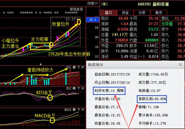 接下来我们再来看下前期盛和资源这只票,该股也是非常符合安安的三步抓妖法的选股思路。和上支票几乎同样的走势,前期股价小幅拉升主力建仓,随后股价一波箱体震荡主力吸筹,在7月26号MACD和KDJ同时形成金叉买入信号,安安果断给大家选出发文讲解,讲解完之后量能持续放大,股价随之拉升上涨,14个交易日涨幅高达66.65%!当然错过的朋友没有关系添加安安薇衅呺:ghaa58或qq:932058005