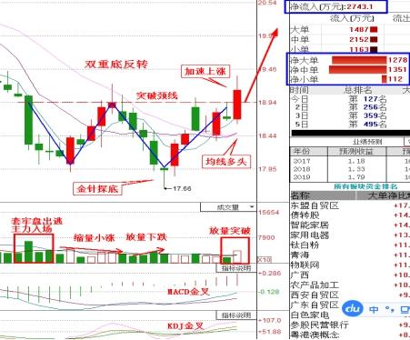 该股股价下跌到15年底部受到支撑,形成双重底反转。其中左肩放量下跌,说明套牢盘割肉出局,那么散户敢在大跌中买入吗?当然不敢,明显是主力在打压吸筹。而且在上涨时缩量,在下跌时放量,明显有大资金在边建仓边洗盘,并且主力高度控盘。在最低价17.66元形成金针探底,是主力盘中打压股价有快速拉回形成的向下试盘,测试底部支撑强度。现在股价放量大阳线突破双重底颈线,并且MACD和KDJ金叉,20日线拐头向上,均线多头,说明突破有效,上升趋势形成。此股已经发布在安安的专栏了,并且会给出详细的布局思路,想要抓住的粉丝朋友可以直接添加安安薇衅呺:ghaa58或qq:932058005查阅学习!