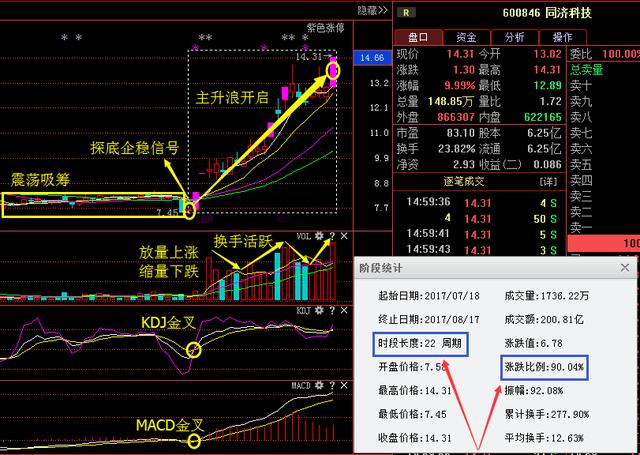首先我们先来看安安前面一直说的的同济科技600846,该股是安安在7月18号根据三步抓妖战法选出且给朋友们发文讲解的,大家可以看到该股前期一直处于一个震荡吸筹的状态,随后在7月18号当天股价形成一根下影探底企稳信号,于是安安果断给大家选出讲解,讲解完之后主升浪开启,其中放量上涨缩量下跌换手活跃可见其股的热门性。实属难得的一大牛股,自安安讲解完之后短短22个周期涨幅高达90个点!在这也是恭喜学会了安安三步抓妖战法且把握到了这波收益的朋友