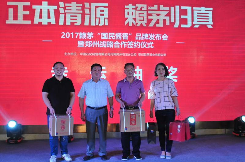 2017年8月28日,由贵州赖茅酒业有限公司和中国石化郑州石油分公司联合主办的2017“国民酱香”战略暨赖茅新品上市发布会在郑州天鹅城国际饭店召开,贵州茅台酱香酒营销有限公司副总经理郑悄然女士、副总经理杜建先生,贵州赖茅酒业有限公司总经理宿梦爝先生、河南省酒业协会会长熊玉亮先生,中国石化河南石油分公司领导副总经理李秀山、非油品业务处及零售处等部门负责人、中国石化河南郑州石油分公司总经理崔保林等出席了会议。