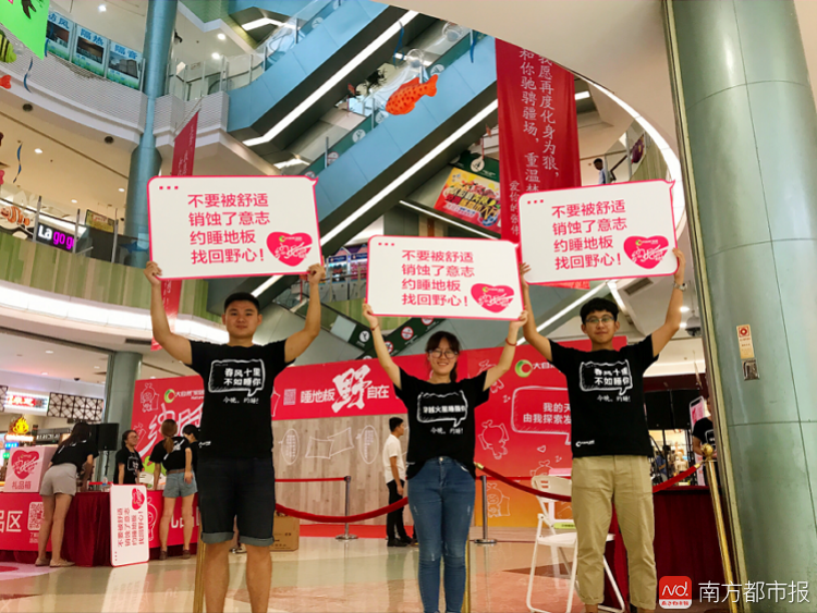 现场除了浪漫的场景布置,商场里各种地贴、垂幅、背景墙、手举牌等上面满满都是 “不要被舒适,销蚀了意志;约睡地板,找回野心!”“没睡过地板,不算真老板”等各种励志走心的话语。参与者,除情侣、朋友,家庭和儿童也不少。据透露,举办这场“约睡”派对,是希望通过睡地板的互动体验,让人们释放内心的野性,呼吁找回丢失的野心,找回初心。