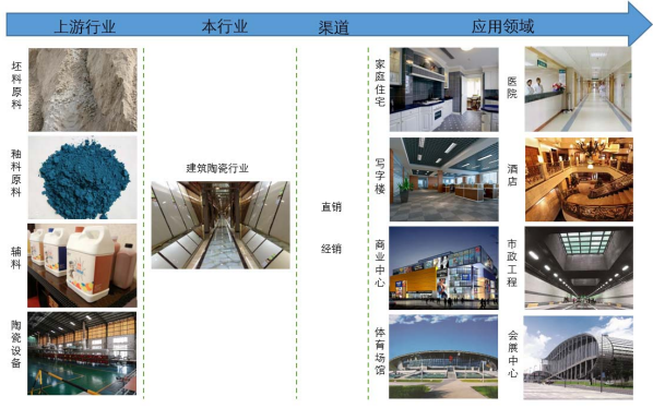 蒙娜丽莎上游行业包括矿物原料、釉原料的原材料开采及加工业、各类辅料的生产制造和陶瓷加工设备,下游行业为建筑装修装饰。