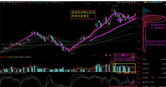 4、典型老鸭头形态即将突破。股票走出标准的老鸭头看涨形态,目前即将突破,主力将展开拉升趋势。