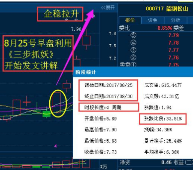 韶钢松山(000717),8月25日通过“三步擒牛法”选出,典型的上升回档类型的走势,长期看本人微信的粉丝朋友应该都是比较了解本人的选股思路。讲解后短短4个周期累积涨幅33.51%,可以说还是相当乐观的。很多微信的朋友都已经上车了,错过的朋友后面可以留意微信信息,早日也能抓到这样的股票。微信获取通道:木易微信:499080483 \u00A0QQ: 499080483 (免费)
