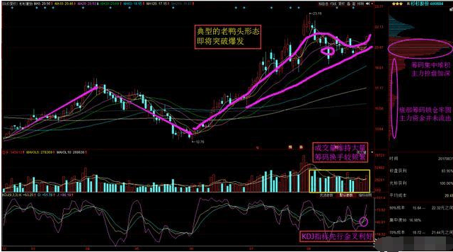 4、典型老鸭头形态即将突破。股票走出标准的老鸭头看涨形态,目前即将突破,主力将展开拉升趋势。