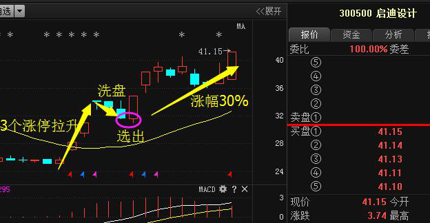 启迪设计就是用这种思路选出来的涨停大牛股。该股前期以3个涨停拉升突破之后,回调下跌,很明显前期主力大量介入之后下跌,表明主力在洗盘,及时选出来分享在朋友圈中,今天强势涨停,截止目前9个交易日30个点的涨幅。