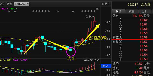 同样的思路选出合力泰短线牛股,回踩至支撑点位选出,分享在朋友圈中,截至目前涨幅也是高达20%。