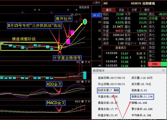 \u00A0 \u00A0 \u00A0 \u00A0接下来我们来看600876洛阳玻璃,该股是本人在8月15号专栏同样根据“三步抓妖战法”选出发文讲解的,大家可以看到该股前期一直处于横盘整理阶段,随后在8月15号当天形成十字星企稳信号,且MACD和KDJ也形成金叉买入信号,本人看到之后也是第一时间给大家讲解,讲解完后展开拉升,截止到今天收盘涨幅31个点之余!