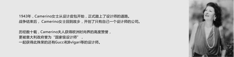 从一个皮包设计师开始,到成为拥有自己品牌的Camerino女士,在品牌名称上冠以自己家族Camerino 姓氏,代表着“从一个意外的开始,到拥有一个事业”,让品牌名称更为传奇性与完整性。