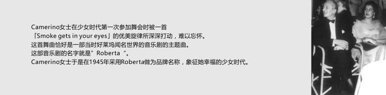 Camerino女士在少女时代第一次参加舞会时被一首“Smoke gets in your eyes ” 的优美旋律所深深打动,难以忘怀。这首舞曲恰好是一部当时好莱坞闻名世界的音乐剧的主题曲。这部音乐剧的名字就是“Roberta”。Camerino女士于是在1945年采用Roberta做为品牌名称,象征她幸福的少女时代。