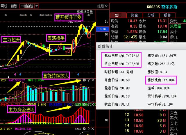 鄂尔多斯600295是在7月12号运用“一分钟选股法”选出并在专栏讲解的,股价在底部启动,在市场派息的利好消息刺激下,主力大量资金进场,股价持续上涨,量能逐步放大,拉升后回踩主力成本,展开震荡吸筹的奏疏,蓄力上攻,在8月17号出现十字星企稳信号后再次展开一波上攻行情。截止目前短短33个周期涨幅高达77.89%。当时很多粉丝朋友,看到了专栏文章,都是抓到了这一波收益,你抓到了吗?
