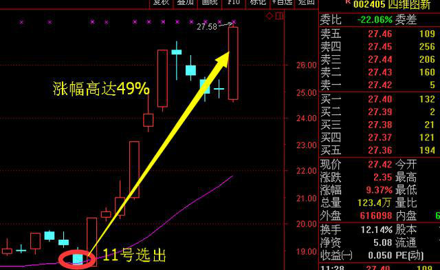 再来看下四维图新,也是用相同的选股法在11号选出来的,之后股价一路上涨,截止目前,涨幅高达49%,朋友圈上的不少相信是抓到了这波收益的,当然没在意的朋友肯定是抓不到的。