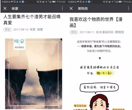 超级号咪蒙创作的《人生要集齐七个渣男才能召唤真爱》与粥悦悦的创作漫画《我喜欢这个物质的世界》快速突破10万+,成功激起受众对极繁与极简的评论。