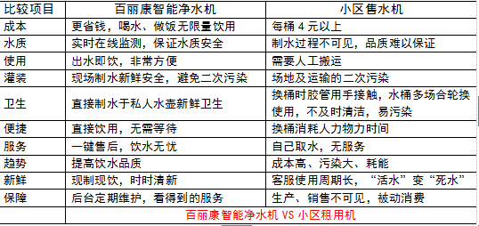 百丽康智能净水机与小区售水机对比: