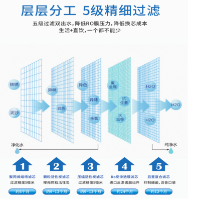 第四层过滤,RO反渗透膜滤芯:美国航天技术,过滤孔径为0.0001微米(0.1纳米),一个细菌要缩小四千倍,传染性病毒要缩小200倍才能通过。因此可有效滤除水中细菌、病毒、重金属离子,农药残留、有机物化合物,无机盐类脱盐率达99%保留人体矿物质和微量元素。