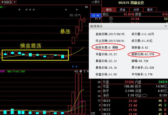 国盛金控:当时通过形态选股讲解,前期股价在横盘调整的过程中,主力资金仍在持续的流入,底部kDJ给出了金叉信号,当即发文讲解,可以看到讲解之后短短6个周期累积涨幅42%。这就我的粉丝朋友才能够有机会抓到的涨幅空间。