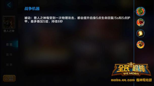 ??战争机器(被动技能):兽人之神每受到一次物理攻击,他的生命回复速率和护甲值都会提升。