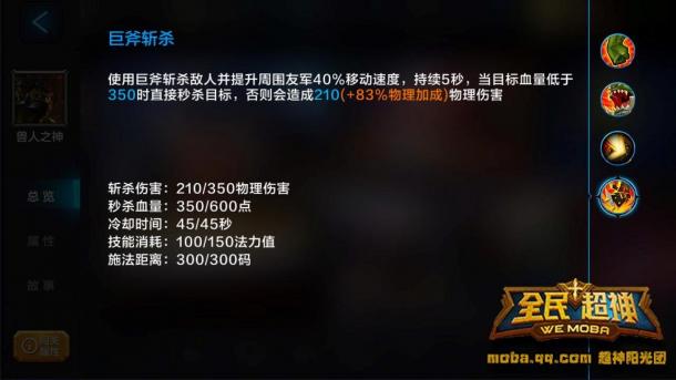 ??巨斧斩杀:使用巨斧斩杀敌人并给周围友军加速,斩杀将对敌方单位造成范围伤害。