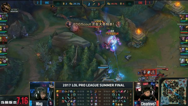 作为EDG让二组追三的最后一场,Clearlove7和大部分人预期的一样,总会带来一些不一样的东西,猪妹在开局打完红BUFF之后就完美绕开视野对下路进行一波GANK,导致RNG下路AD送出一血。三四分钟的相安无事之后,皇子配合酒桶在上路击杀兰博,但此时厂长的猪妹在中路配合卢锡安越塔完成了对发条的击杀。这一把RNG选出了偏向发育性的中单,EDG明显开始针对发条,两分钟后发条再次惨死塔下。好在这两次死亡对RNG并没有造成太大影响。随后的20分钟双方在小规模团战上都没有占到太多便宜,直到比赛进行到第29分钟的时,UZI中路头铁猛点寒冰,然后被反手秒杀,EDG通过一波0换3拿到第五场比赛的第一条大龙。通过大龙所带来的优势成功破掉RNG三路高地,最后42分钟左右,Meiko牛头在敌方高地一波闪现开团,直接断送了RNG夏季赛的冠军梦,成功完成EDG队史首次的让二追三。