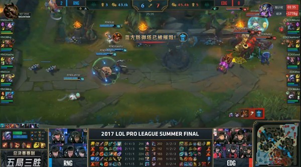 第三局EDG稳住心态,在阻止RNG再次拿到大虫子的情况下,开始和RNG进行周旋。开局三分钟厂长利用皇子EQ闪现成功挑飞EZ,iboy小炮立刻闪现在下路拿到EZ的一血。之后长达十分钟的时间双方并未爆发战斗,随后乐芙兰和大虫子组成二人组屡次抓住RNG上单的失误将其击杀,并且利用这些关键时间在比赛进行到22分钟的时间成功拿下大龙。站在悬崖边上的EDG利用大龙稳扎稳打,拔掉了RNG的所有外塔。虽然在后面的第32分钟,RNG强行打下大龙,不过也付出了团灭的代价,在比赛进行到38分钟的时候,EDG成功推下RNG主水晶,拿到夏季决赛第一胜,此时比分1比2