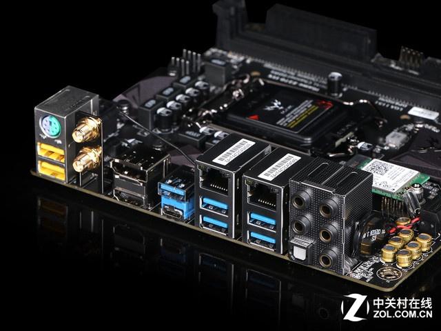 背部接口这里我们看到配置的还是很全的,PS/2键鼠接口,两个USB\u00A02.0电竞接口,无线网卡的天线。旁边是HDMI/DP的视频接口,6个USB\u00A03.0接口(其中一个为Type-C形式存在)。双千兆网卡,分别为Intel\u00A0I219V和Realtek\u00A0RTL8118AS。一组音频接口,芯片为ALC\u00A01150。