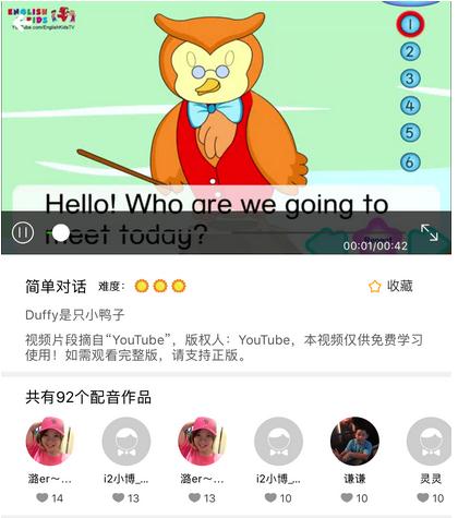 所有内容均是以1-2分钟短视频呈现。选择一个视频点击进入“开启配音”,便可以跟着视频里的老师或角色跟读,每个视频被拆分为若干句子,完成所有句子配音后,系统会自动合成一个完整的新视频,使用者便可以将自己配音的视频“秀”到App里的配音广场版块,还可分享至朋友圈、微博等平台上。