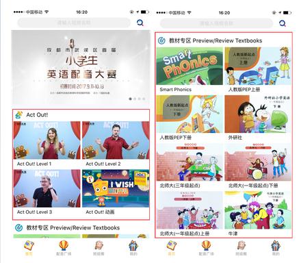 记者看到,进入APP首页之后,配音素材被分为四个版块,分别为:Act Out、教材专区、配音乐园、最新视频。