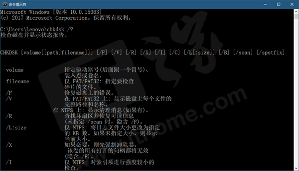 上面列举的两种用法已经基本上可以满足你的实际需求了,如果你想了解更多关于chkdsk命令的用法,则可以通过以下命令: