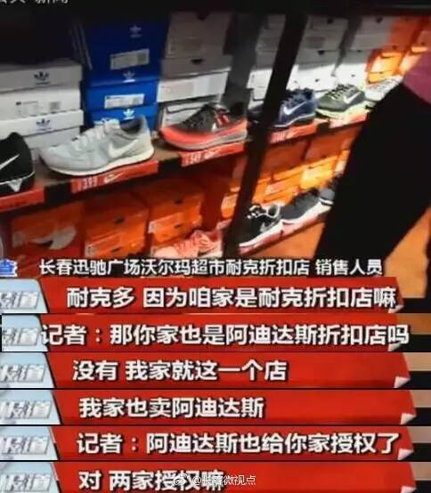 随后记者来到了前进大街沃尔玛超市内,这里也有一家耐克及阿迪达斯折扣店,这里所售卖的运动鞋运动服和前两家售卖的一模一样。