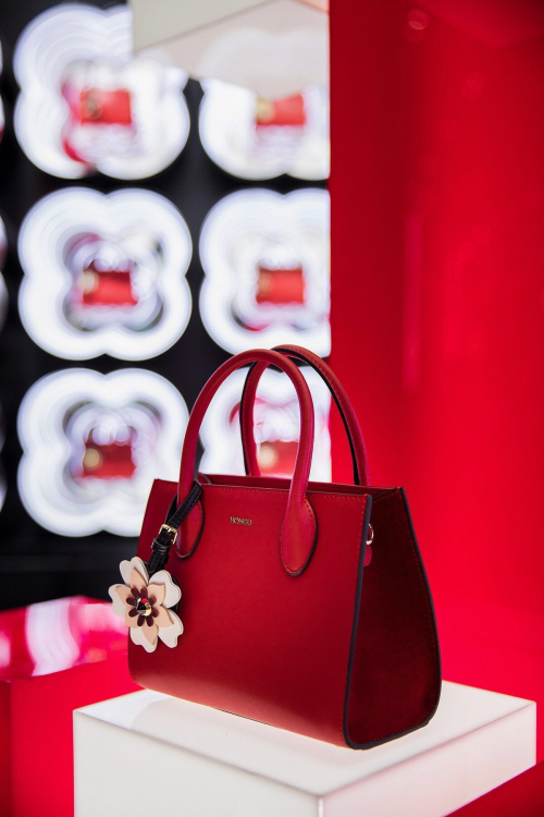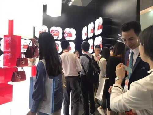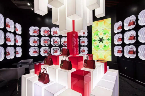 展台的光柱设计如同“火山迸发”,体现了红谷品牌无限的能量以及全新的蜕变。展厅以黑色、红色、白色为三大主色调,店内以红谷近期爆款之一的红色包款作为主陈列款,清一色的红色包包配以不同花型的吊饰,加上灯光及LED特效的渲染,整体视效和谐大气,时尚而灵动,受到与会众多购物中心甲方及各品牌代理商的交口称赞。
