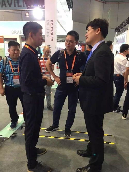 ▲ 红谷集团副总裁周攀峰(左)在展会现场与嘉宾洽谈