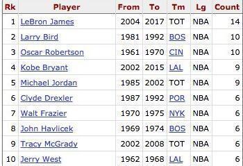 具体排名为:勒布朗-詹姆斯:14次;拉里-伯德:10次;奥斯卡-罗伯特森:10次;科比-布莱恩特:9次;迈克尔-乔丹:9次;克莱德-德雷克斯勒:6次;沃尔特-弗雷泽:6次;约翰-哈弗里切克:6次;特雷西-麦克格雷迪:6次;杰里-韦斯特:6次。