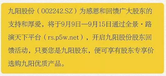 全景网8月31日讯\u00A0九阳股份(002242)周四晚间发布公告称,2017年9月9日-2017年9月15日公司为回馈所有股东特在全景网路演天下(http://rs.p5w.net/)举办“9.9九阳股份股东回馈日”活动,凡是九阳股份的股东即可享受大幅低于市场价的“股东专享价”,产品包括豆浆机、破壁料理机、原汁机、面条机、电饭煲、热水壶、炒菜机、洗碗机等数十件产品,基本涵盖所有厨房小家电,其最高优惠幅度直降近1800元!