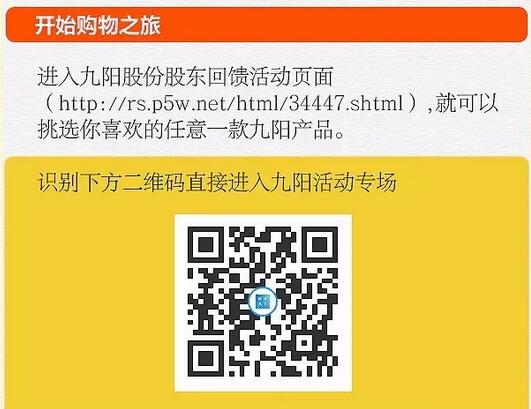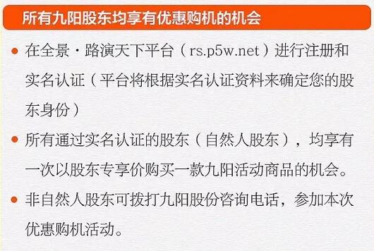 本次九阳股份股东回馈日活动,公司希望用高品质的产品和实惠的价格回馈九阳股东,以感谢广大股东对公司一直以来的相伴、支持与厚爱,同时也希望股东通过使用体验“自己公司的产品”,增强投资信心,继续与公司奋力前行,再创佳绩!
