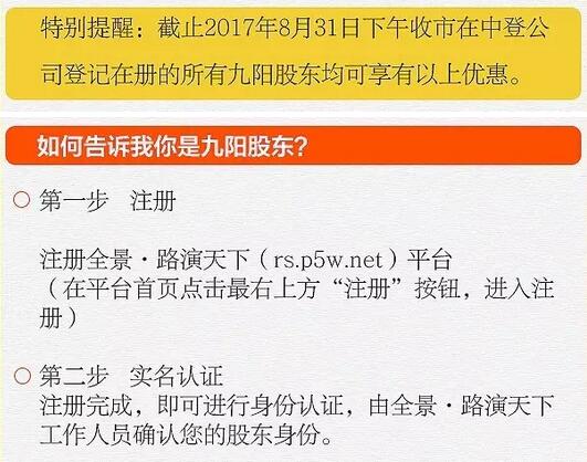 公告显示,参加九阳股份本次股东回馈日活动的股东范围为:2017年8月31日(星期四)下午15:00交易结束后在中国证券登记结算有限责任公司深圳分公司登记在册的公司全体股东(包括通过融资融券交易持有本公司股份的股东)。