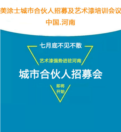 目前活动已到河南,诚邀您参加7月份“美涂士城市合伙人招募及艺术漆培训会议”,届时会有美涂士专业指导艺术漆的销售和施工技巧,详细讲解“健康高效墙面涂装体系”的特点和现场体验,共谋携手发展愿景,共商交流合作大计。