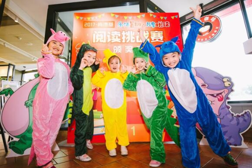 翅膀扇一扇,旋风跟着转的翼龙;四肢一抱紧,立刻变球形的腕龙,还有闷头加速度,谁都挡不住的三角龙……9月3日下午一点,沈阳肯德基东顺城餐厅里早已人气满满,在肯德基“乐享暑期·共享悦读”读书营中表现优秀的明星小书迷们将在这里举办他们的颁奖礼,而除了丰盛的奖品,现场更特别为他们布置成最爱的恐龙主题,面对平日里爱不释手的恐龙形象,孩子们显得格外兴奋又激动。