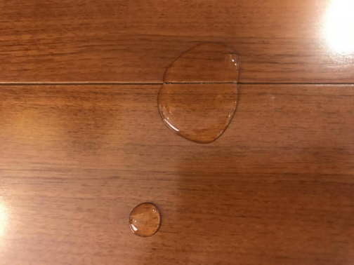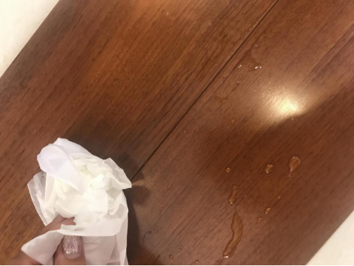平时地板渗水之后边缘会翘起影响美观,小编在店内拿起了水杯把水倒在2块地板的拼接缝隙处,静置3分钟,大家可以看到水团没有扩大和下漏现象。另外用纸巾去擦拭水的时候也会发现地板表面光滑,没有渗入地板内,一擦就干。