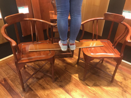 最后一项是抗压测试,将一片地板放在两把椅子上,小编整个人站在地板中间。从图中可以看到,地板并没有明显的弯曲痕迹,说明地板承重能力好,不易折断。
