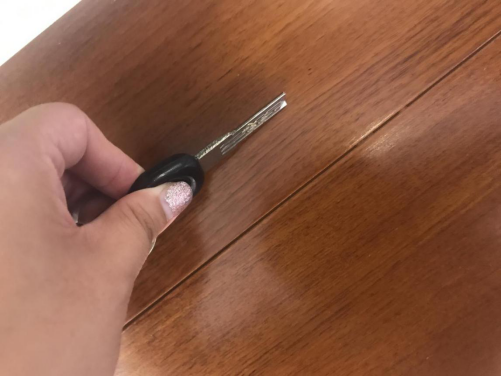 另外一个让家长头疼的就是家里的熊孩子除了会在地板上画画和留下污迹之外,还会在地板上玩各种玩具,容易产生划痕,并且又是家中尖锐的东西也会破坏地板表面。小编就用了钥匙在这款柚木实木地板上来回用力划痕,也没有留下任何痕迹。因此这款地板耐磨性能优越。
