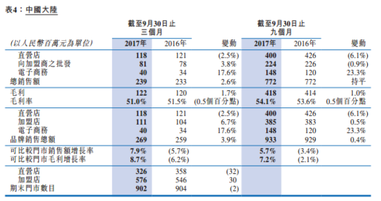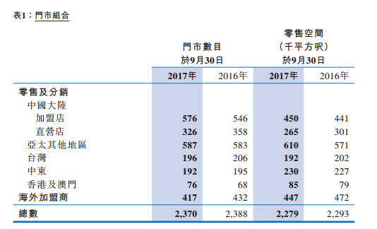 据公告显示,与2016年同期相比,门店总数减少18间,主要是因为关闭印度29间表现较差门市所致,集团正在对印度市场进行业务重组。中国大陆直营店现有326家,比2016年同期减少了32家。