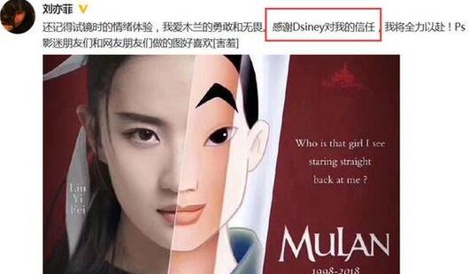11月30日,刘亦菲发文确认出演迪士尼电影《花木兰》,一时引热议。晚间,刘亦菲发文感谢迪士尼。