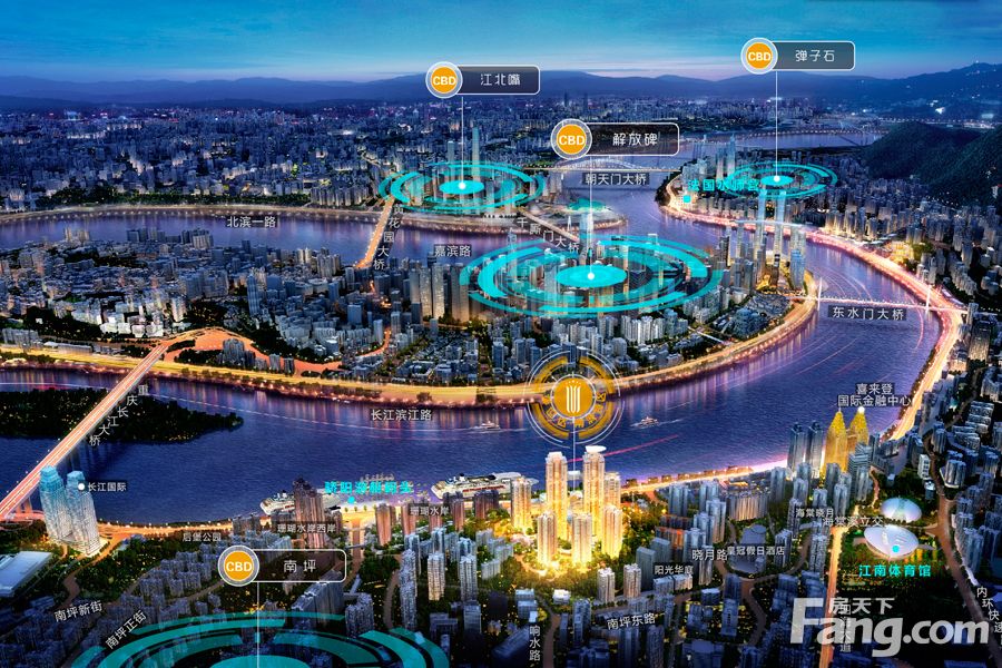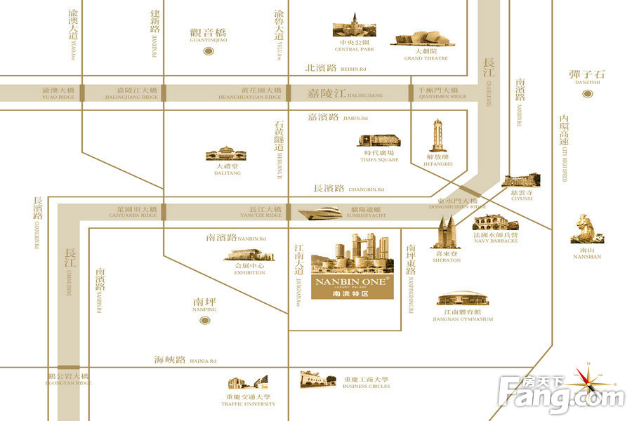 交通状况:项目通过“六桥三轨两道”,以及即将贯通的两江大桥,可以到达解放碑商圈。沿途经过321、304、354、872、873等多条公交路线,在建轻轨环线江南(体育馆站)和已建成的3号线(南坪站)也在项目周边。