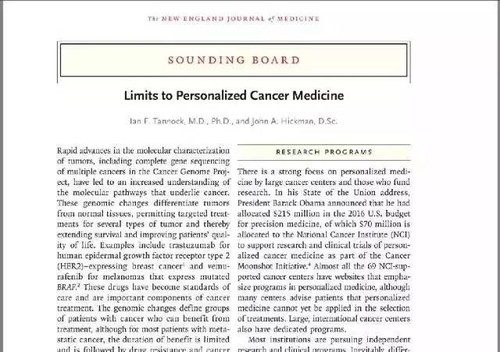 备受关注的“国家级”科研项目“精准医疗计划”,近期遭遇到了两年来最大的舆论风波,来自顶级学术杂志《自然》和《新英格兰医学》的两篇报道,似乎在表示精准医疗概念被“滥用”,肿瘤精准医疗理念的“失败”。
