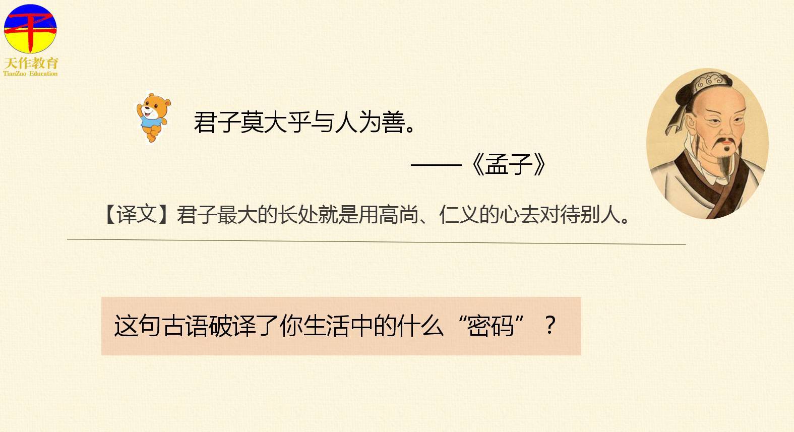 过渡:赵宣子的善良仁义之心让他免遭刺客的残忍杀害,这也教会我们一个重要的道理,正如亚圣孟子说的——君子莫大乎与人为善。