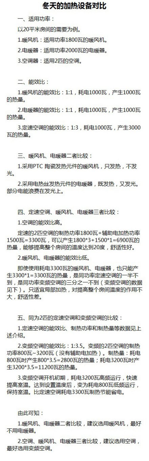 天气一下子冷了下来,你家里安装了什么样的采暖设备来渡过寒冬呢!空调、电暖器、散热片、地暖、电地暖等等哪种取暖方式最省钱呢?有人做了一个实验,在同一个房间里,分别用电暖气和空调供暖一小时,实验结果如下: